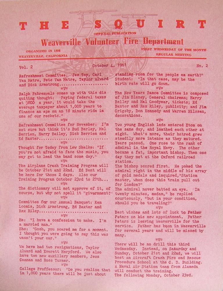 'The Squirt' was the Weaverville Fire Department's monthly newsletter from 1952 to (irregulary) april 2008.