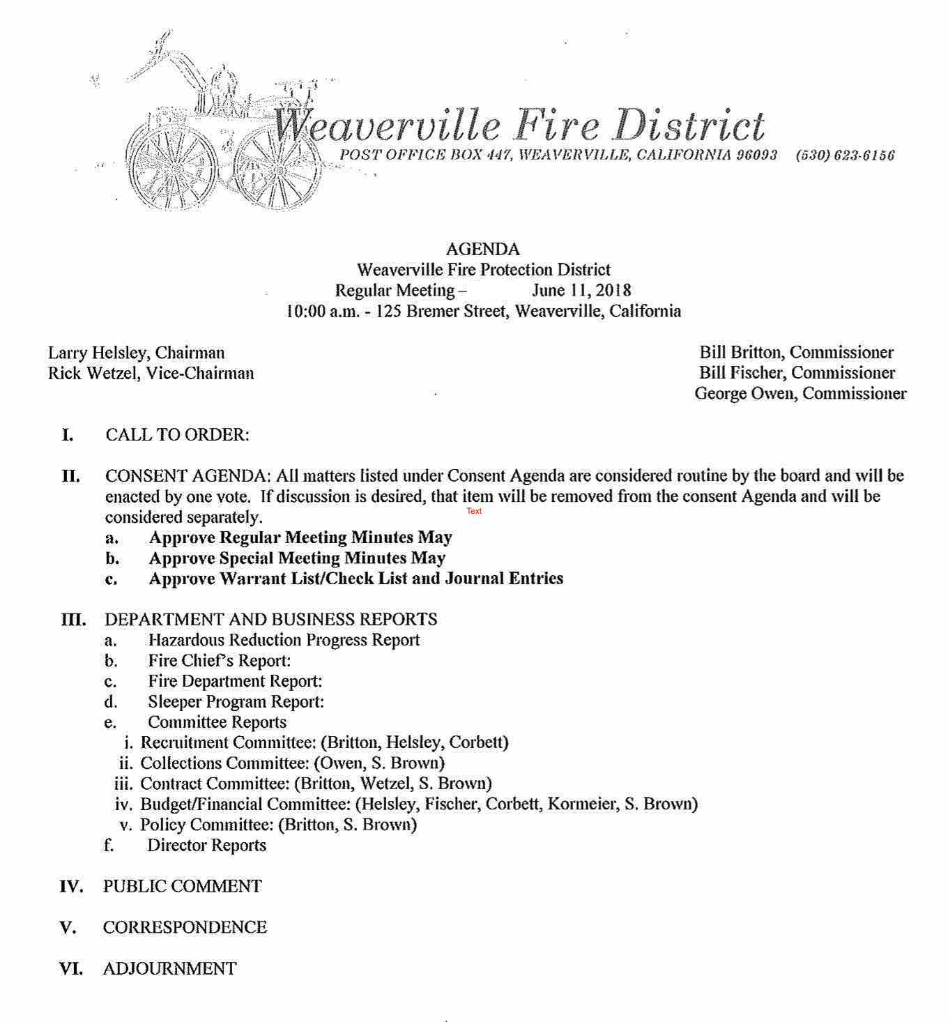 The regular meetings of the Weaverville Fire Protection District will be: