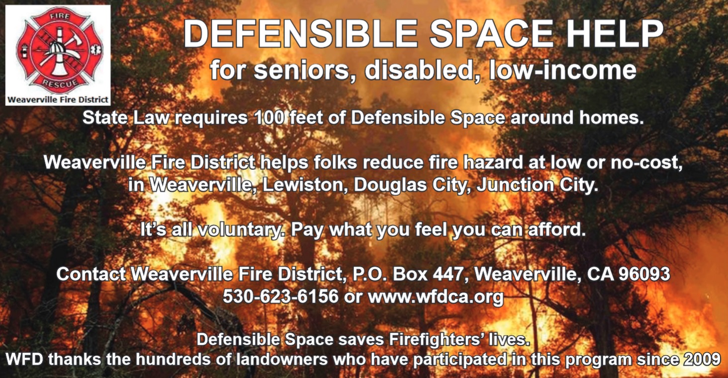 Weaverville Fire District’s Hazard Reduction Program provides weed abatement work, at little or no cost, to elderly, disabled, and low-income persons in the Weaverville, Lewiston, Douglas City, and Junction City areas. Token payment for the service is encouraged, but is completely optional. (Money received is recycled back into the program, so more can benefit.)